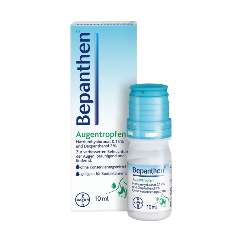 Manchmal hat man im Auge ein Trockenheits- oder Fremdkörpergefühl, das sehr unangenehm und störend sein kann. Die Folgen eines brennenden, rötenden und tränenden Auges können eine Sehverschlechterung und eine verschwommene Sicht sein. Die in Bepanthen Augentropfen enthaltenen Wirkstoffe, die Hyaluronsäure und Dexpanthenol, helfen und schützen sanft. Die Hyaluronsäure bildet einen schützenden, lang anhaltenden Film auf der Hornhaut des Auges. Das Dexpanthenol erfrischt und pflegt das Auge. Egal ob die Augenreizung durch eine trockene Umgebung oder durch eine temporäre Unverträglichkeit der Kontaktlinsen hervorgerufen wurde – die Bepanthen Augentropfen befeuchten, pflegen und schützen die Augenoberfläche.