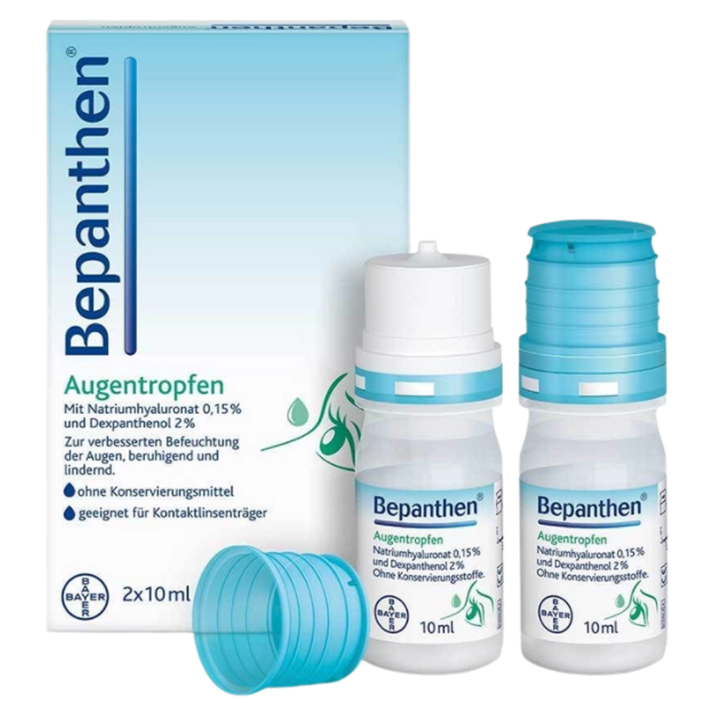 Wer an trockenen und gereizten Augen leidet, kann mit den Bepanthen® Augentropfen die Augenoberfläche befeuchten, den Tränenfilm stabilisieren und somit das Auge vor einem Trockenheitsgefühl schützen. Auf diese Weise wird eine Linderung der Beschwerden erreicht. Die Bepanthen® Augentropfen sind erhältlich als Ein-Dosis-Behältnis (praktisch für unterwegs) und in der Soft-Touch-Mehrdosisflache (insbesondere zur regelmäßigen Anwendung). Die Augentropfen enthalten weder Konservierungsstoffe noch Phosphate. Sie sind für Kontaktlinsenträger geeignet.