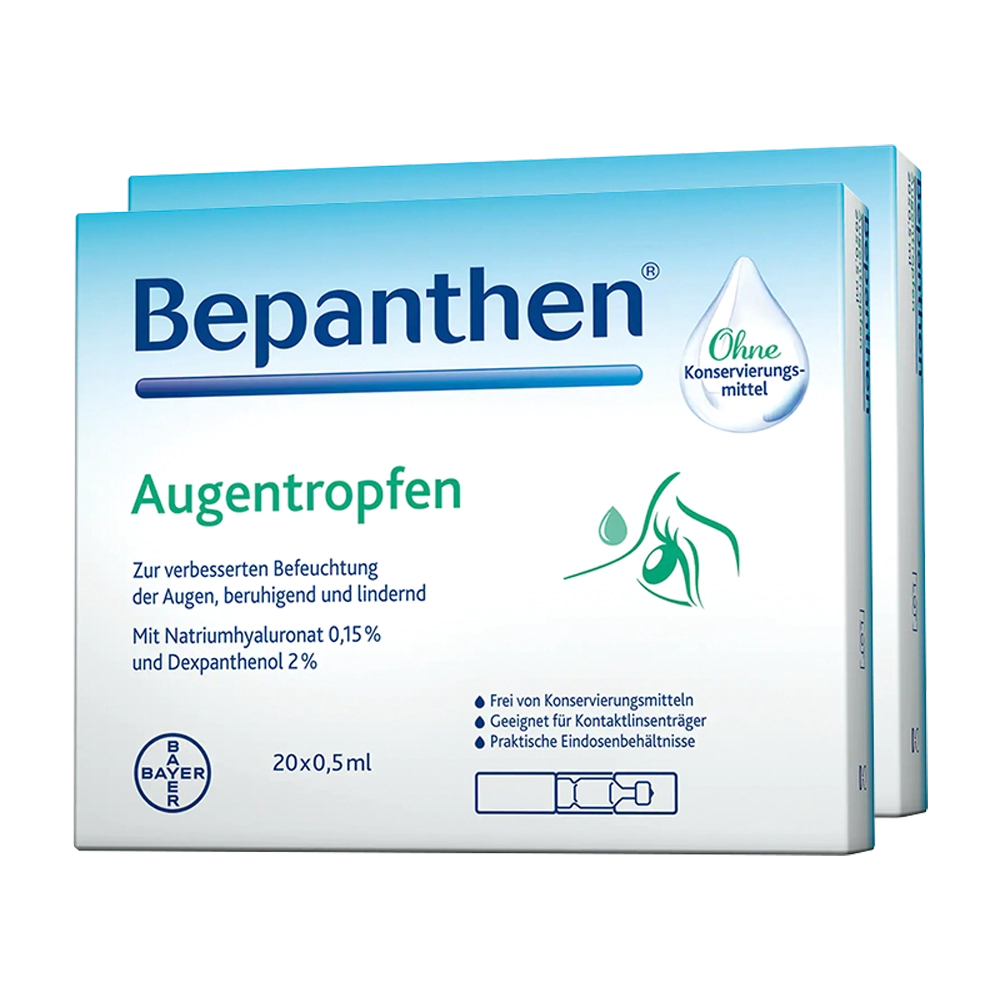 Wer an trockenen und gereizten Augen leidet, kann mit den Bepanthen® Augentropfen die Augenoberfläche befeuchten, den Tränenfilm stabilisieren und somit das Auge vor einem Trockenheitsgefühl schützen. Auf diese Weise wird eine Linderung der Beschwerden erreicht. Die Bepanthen® Augentropfen sind erhältlich als Ein-Dosis-Behältnis (praktisch für unterwegs) und in der Soft-Touch-Mehrdosisflache (insbesondere zur regelmäßigen Anwendung). Die Augentropfen enthalten weder Konservierungsstoffe noch Phosphate. Sie sind für Kontaktlinsenträger geeignet.