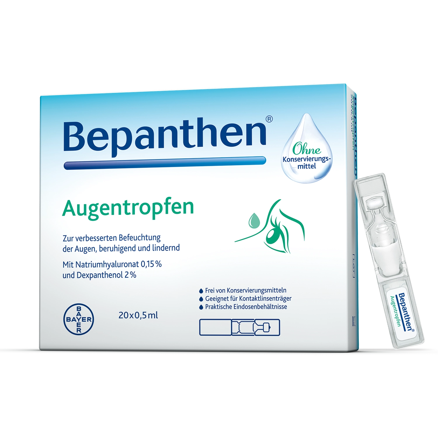 Wer an trockenen und gereizten Augen leidet, kann mit den Bepanthen® Augentropfen die Augenoberfläche befeuchten, den Tränenfilm stabilisieren und somit das Auge vor einem Trockenheitsgefühl schützen. Auf diese Weise wird eine Linderung der Beschwerden erreicht. Die Bepanthen® Augentropfen sind erhältlich als Ein-Dosis-Behältnis (praktisch für unterwegs) und in der Soft-Touch-Mehrdosisflache (insbesondere zur regelmäßigen Anwendung). Die Augentropfen enthalten weder Konservierungsstoffe noch Phosphate. Sie sind für Kontaktlinsenträger geeignet.