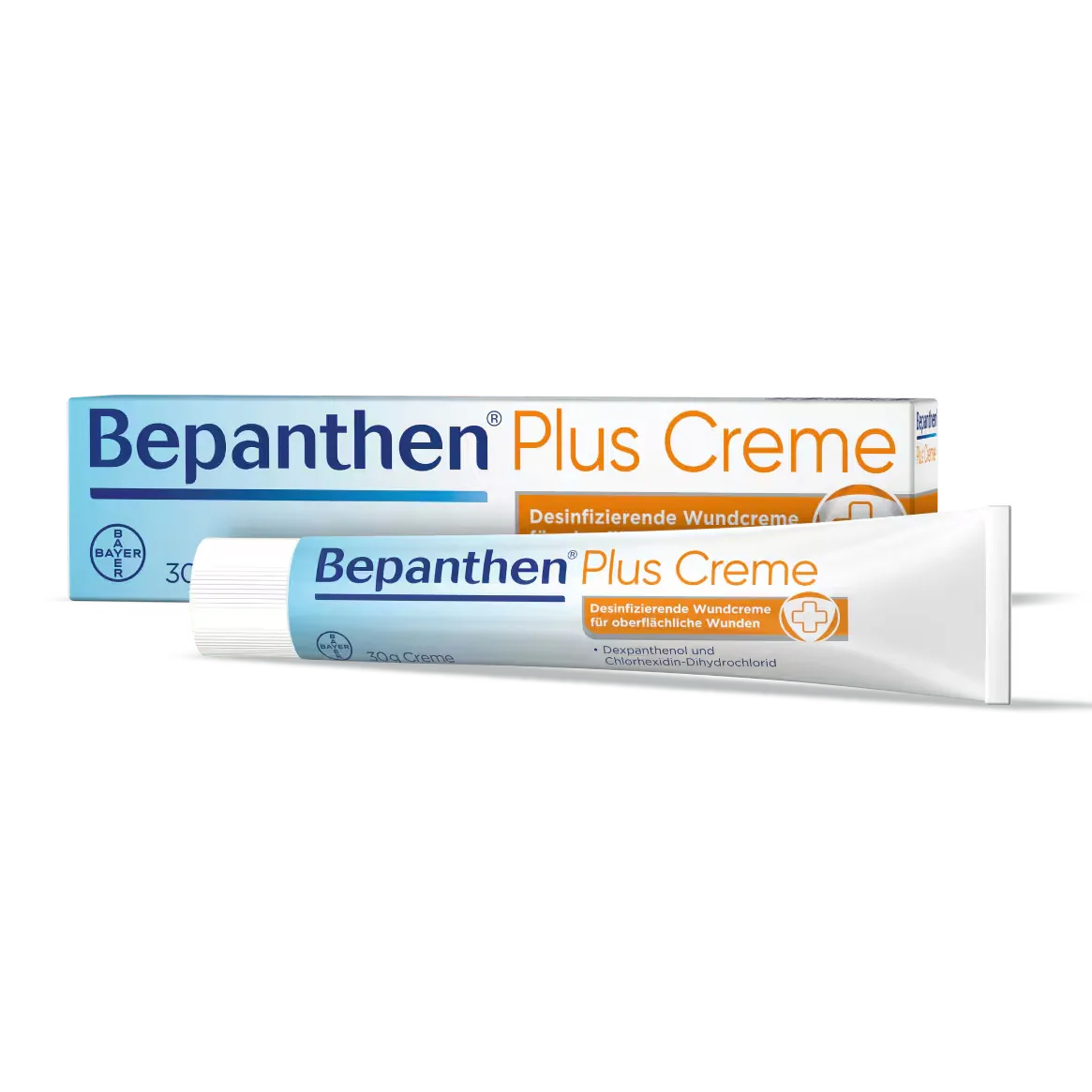 Bepanthen® Plus Creme enthält einen desinfizierenden (Chlorhexidin) und einen heilungsfördernden (Dexpanthenol) Wirkstoff: