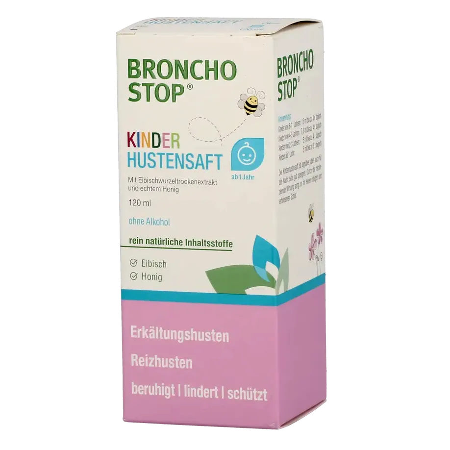 Die in BRONCHOSTOP® Kinderhustensaft enthaltenen wertvollen Inhaltsstoffe Eibisch und Honig wirken wie ein Balsam, der sich beruhigend über die entzündete Rachenschleimhaut legt. Die enthaltenen Schleimstoffe bilden einen physikalischen Schutz lm, der Fremdpartikel fern hält. Dadurch wird der Hustenreiz gelindert und die Schleimhaut kann sich rasch wieder erholen.