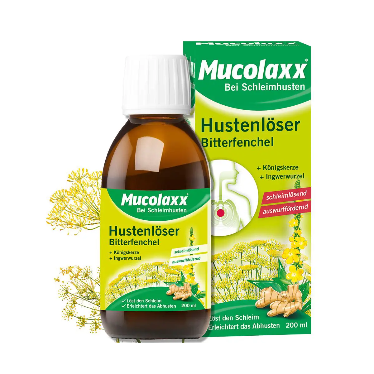 Die in Mucolaxx® Hustenlöser enthaltene Kombination aus pflanzlichem Glycerin mit den Pflanzenextrakten Bitterfenchel, Ingwerwurzel und Königskerze verflüssigt durch ihre physiologischen Eigenschaften festsitzenden Schleim, erleichtert das Abhusten und sorgt so für rasche Genesung.